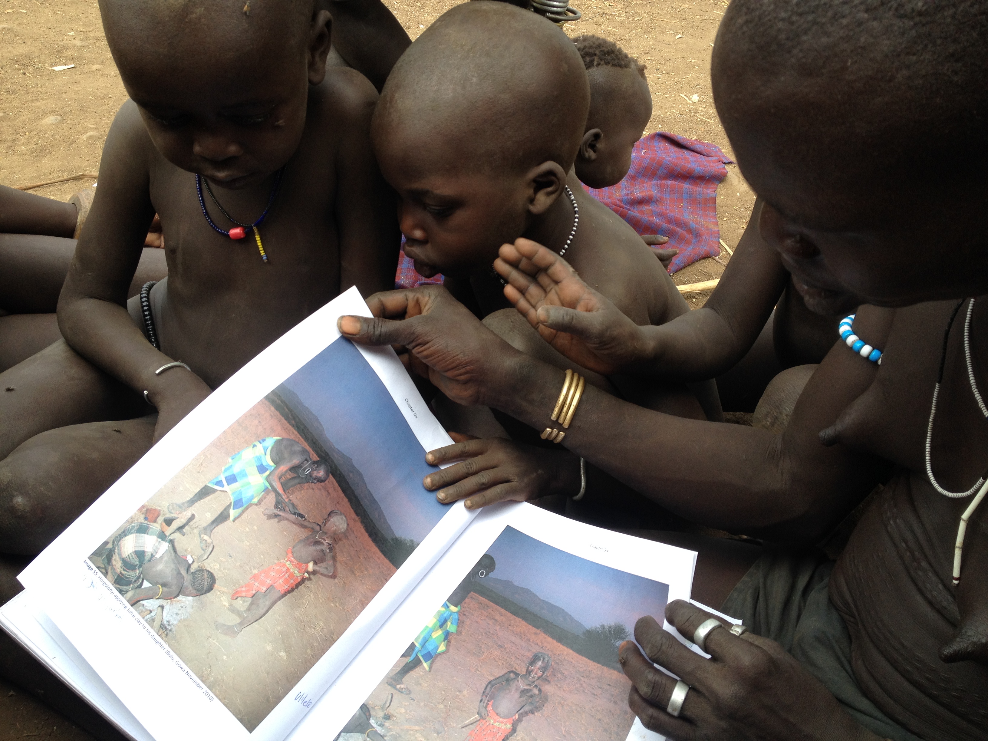 Children and their parents examine a PhD thesis written about their body painting tradition (Diirikôrro 2014)