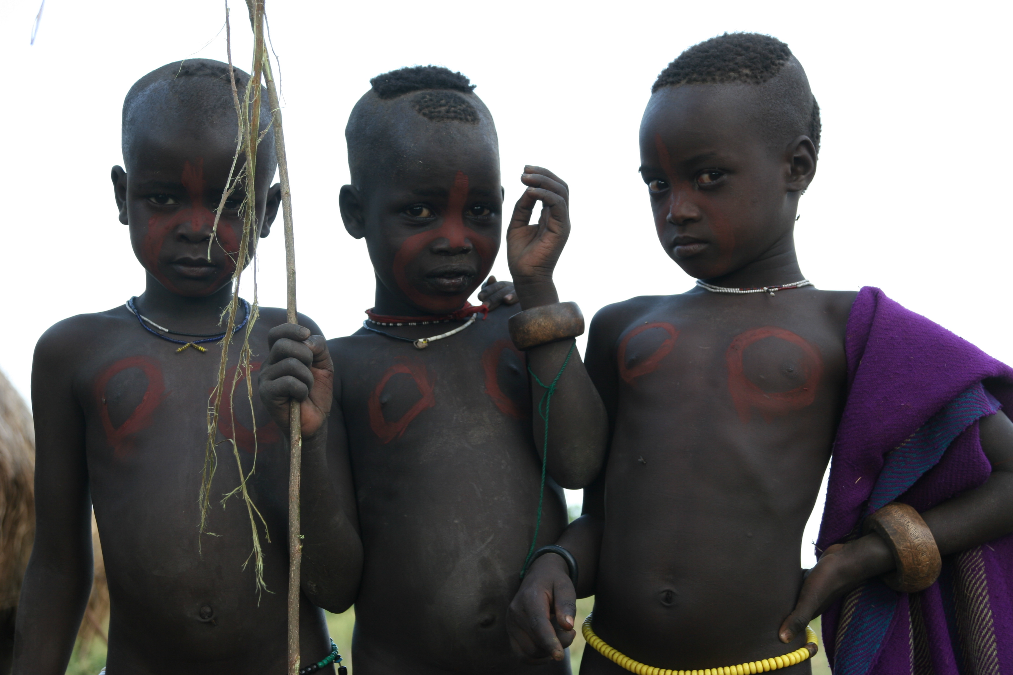 Three little cousins/age-mates found some ochre and creatively decorated one another in mirror image styles (Diirikôrro , 2014)