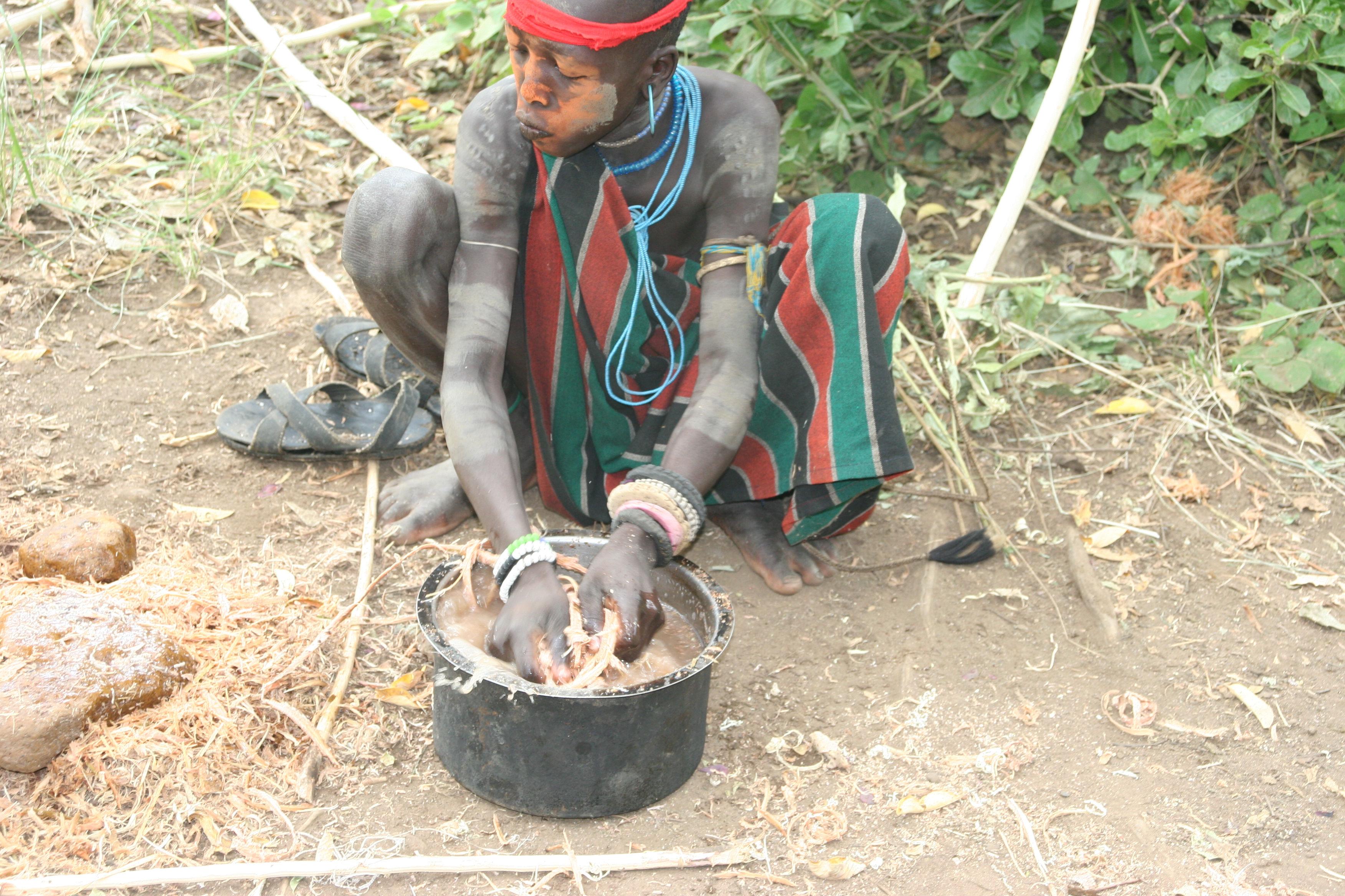 A younger boy is squeezing the juice of a well known anti-worm medicinal plant into water for the older boys to drink (Diirikôrro , 2014)
