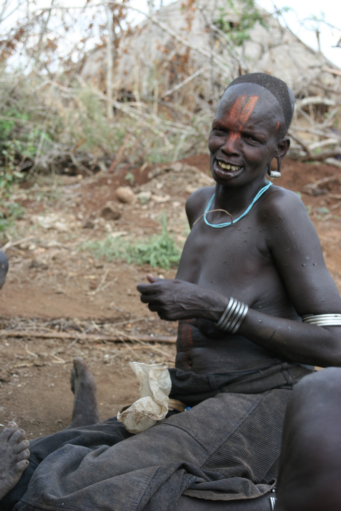 Bharbela is a healer. She has just anointed herself with 'pink' clay, typical clay of the healers, because she is preparing a new healing rattle called togoy, which is used in communal healing ceremony.